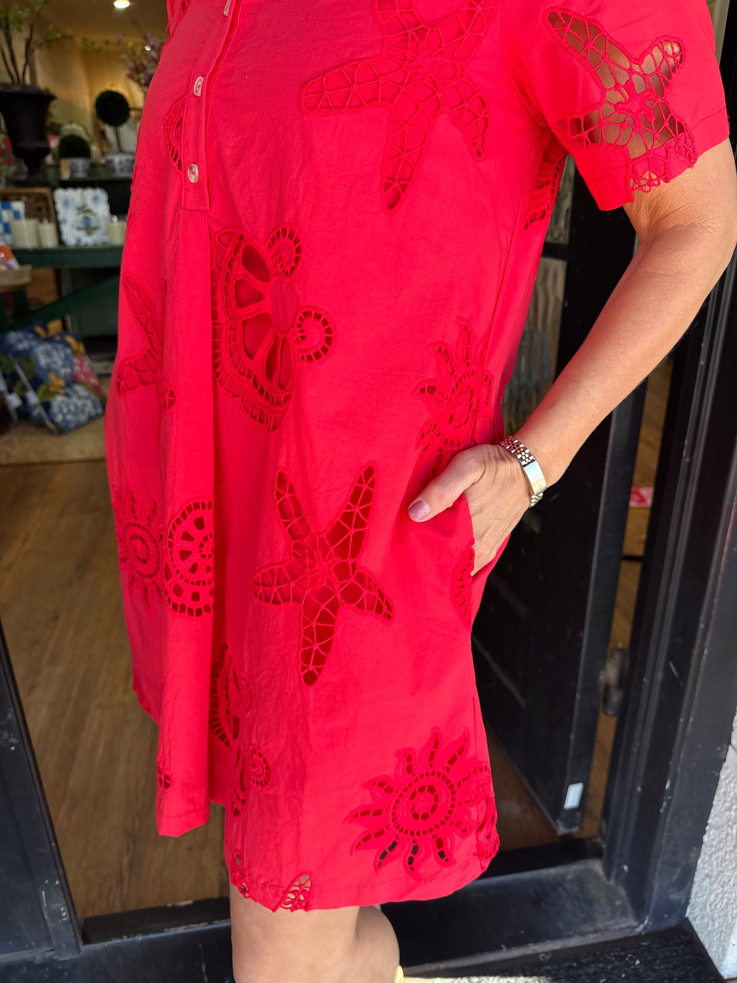 Make a splash in this vibrant tomato red dress, where coastal charm meets everyday elegance. Delicate seashell details dance across the bodice, while classic eyelets add a breezy, romantic touch perfect for warm weather adventures. Whether you're heading to brunch by the water or a casual garden party, this playful piece brings seaside whimsy to your wardrobe.