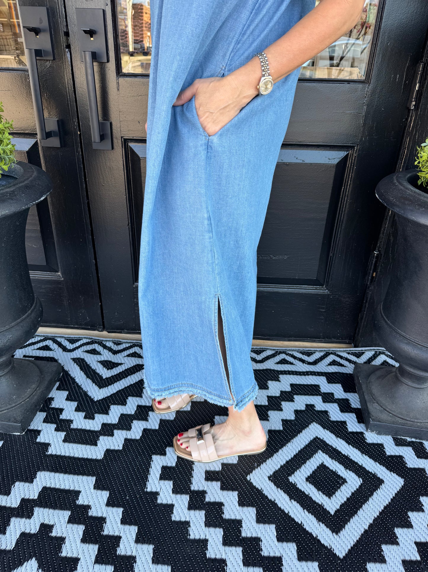 This dress has pockets and a slit on the side.