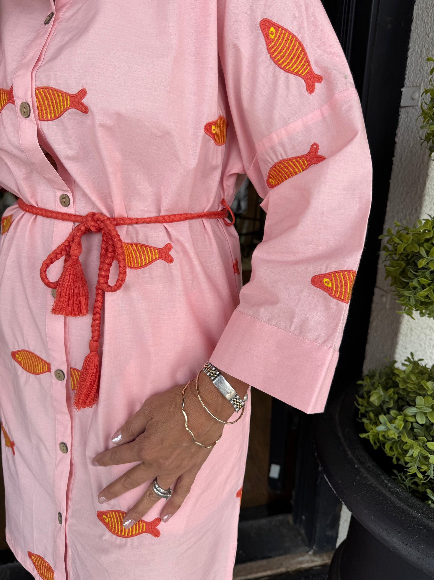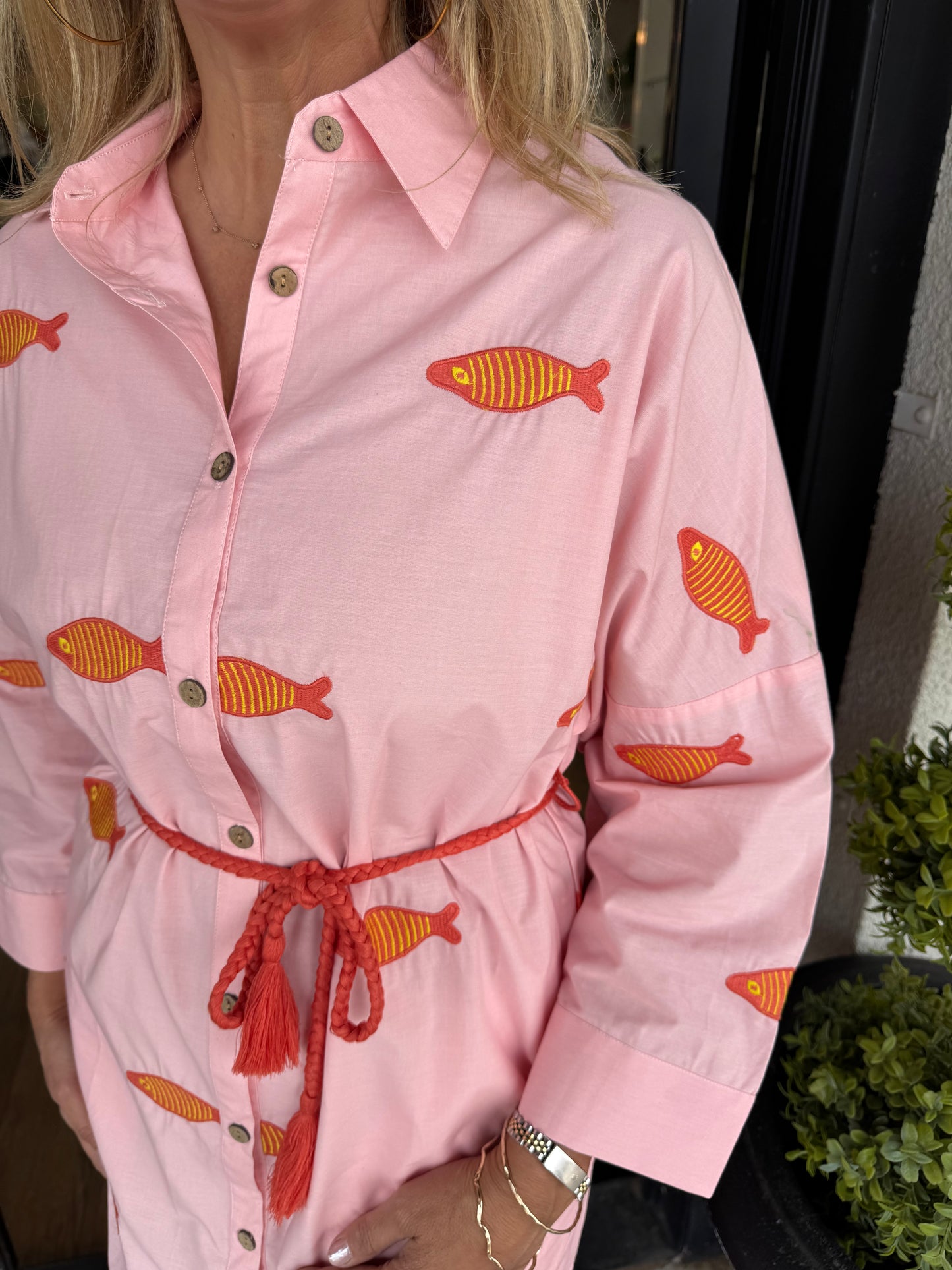 Effortlessly chic and vacation-ready, this Uncle Frank shirtdress features stunning embroidered fish detailing that brings coastal charm to your wardrobe. Lightweight and comfortable, it's your go-to piece for warm-weather style with personality!