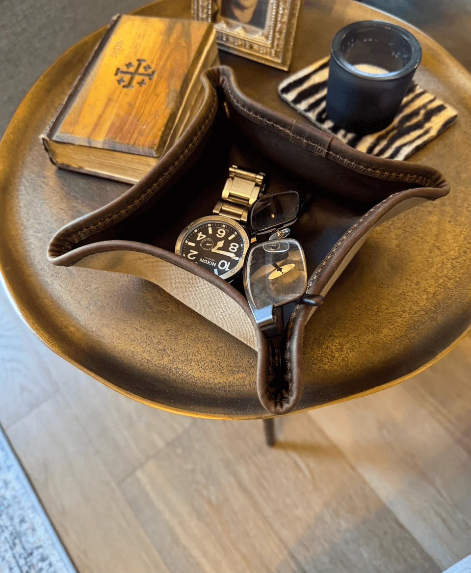 A place for everything, and everything in its place! The JH Catch All keeps your keys, wallet, and essentials tidy at home and on the go. Snaps into a tray, packs flat, and is now available in the JH cotton canvas and oiled leather combo.