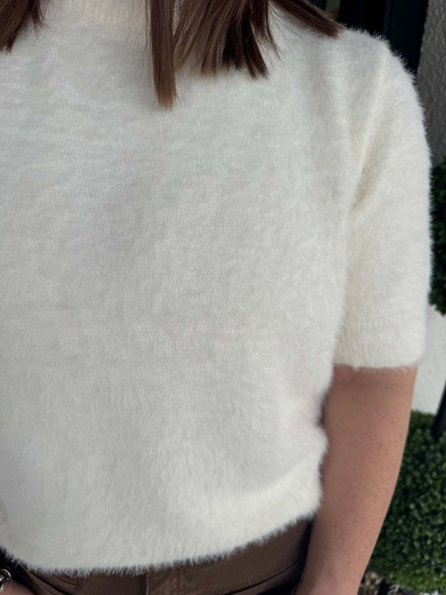 Expertly crafted for comfort and style, the Ashley Sweater in Ivory is the perfect addition to your wardrobe. With its chic white color and short sleeve design, this sweater top offers a versatile and effortless look for any occasion. Made for the modern woman who values both fashion and comfort.