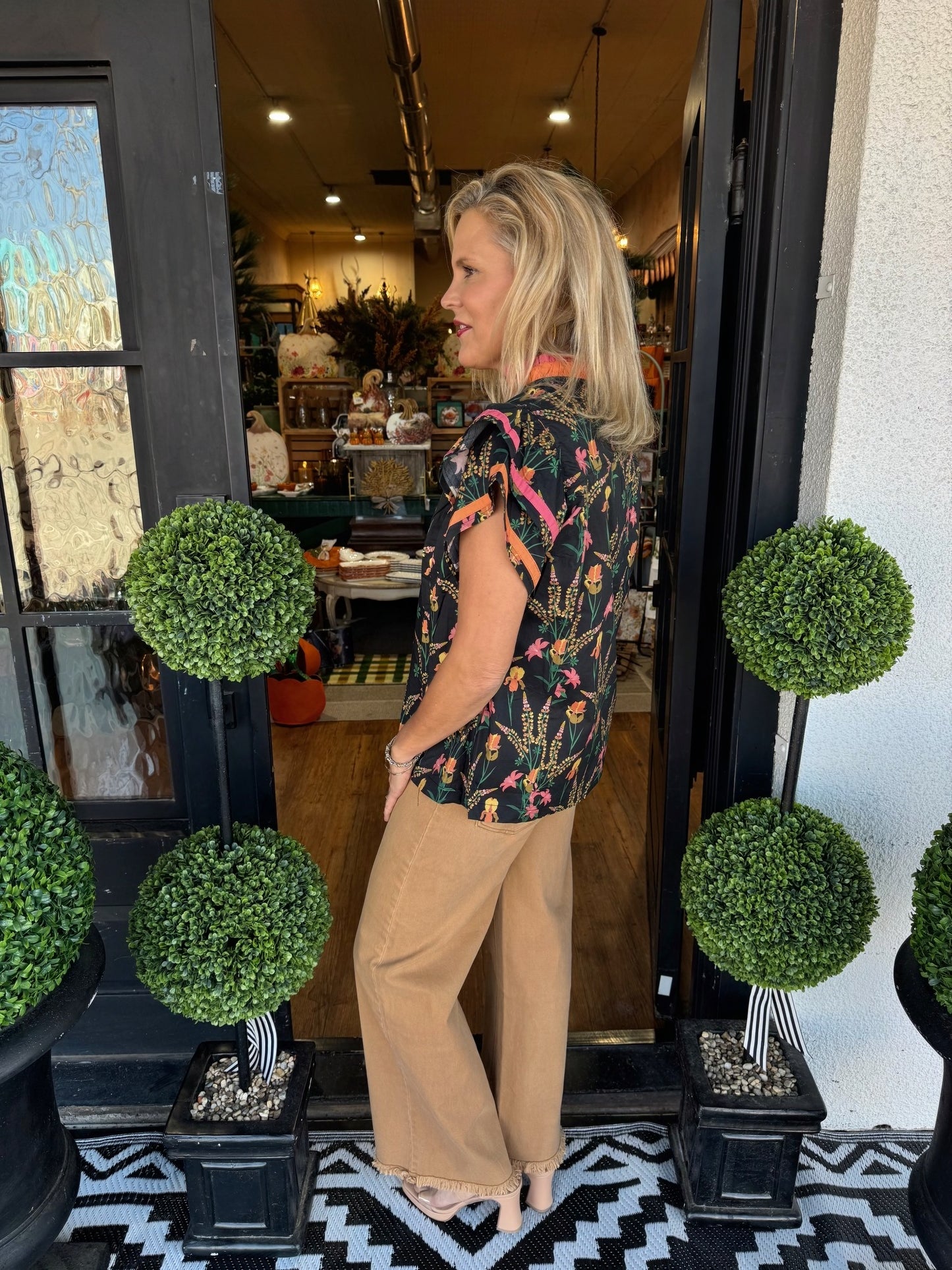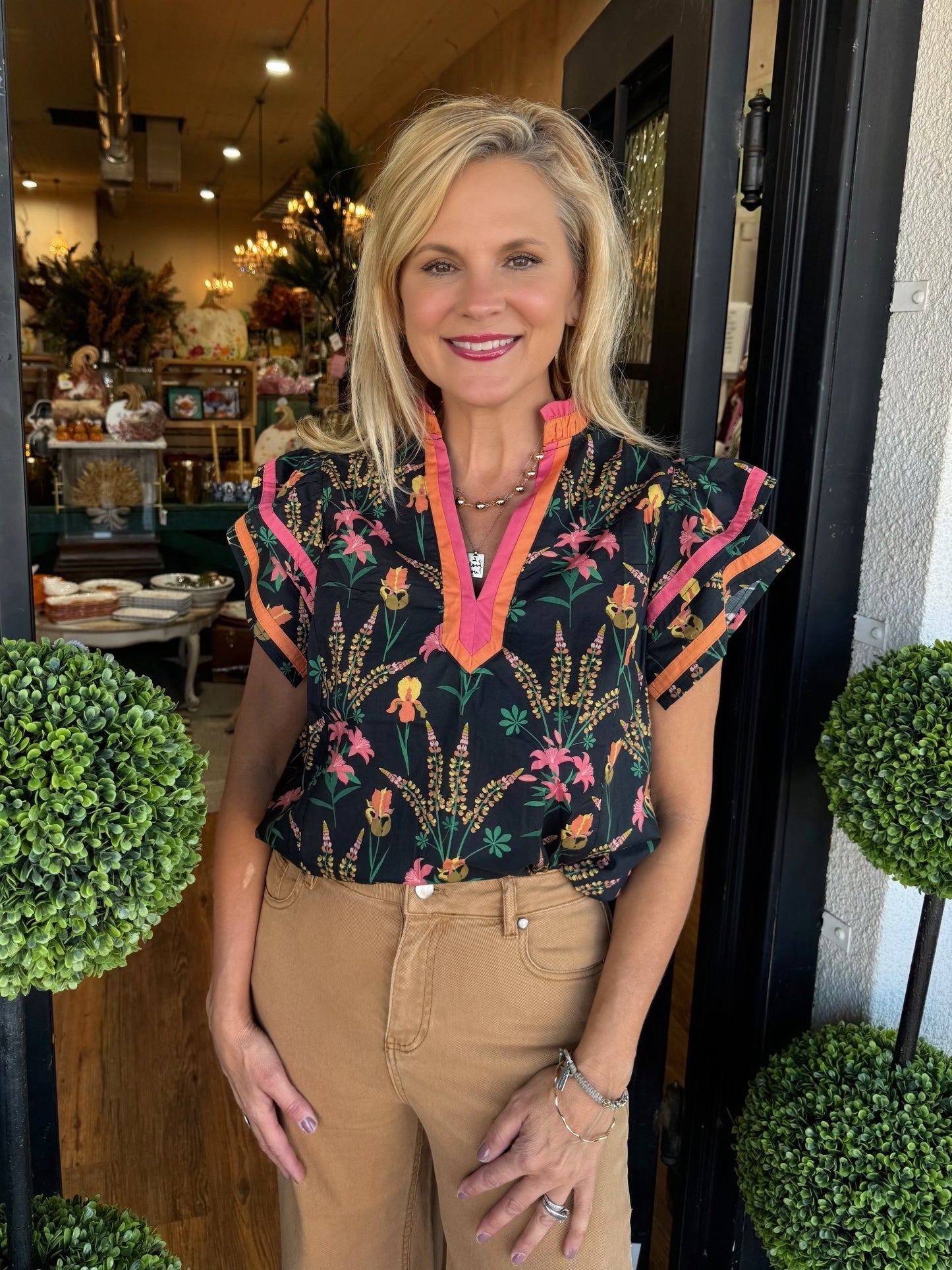 Elevate your wardrobe with the Bebe Top in black, featuring delicate floral accents that add a touch of elegance. The contrasting neckline and sleeve details create a refined silhouette, perfect for sophisticated occasions or polished everyday style. This top effortlessly blends classic charm with contemporary design for a standout look.