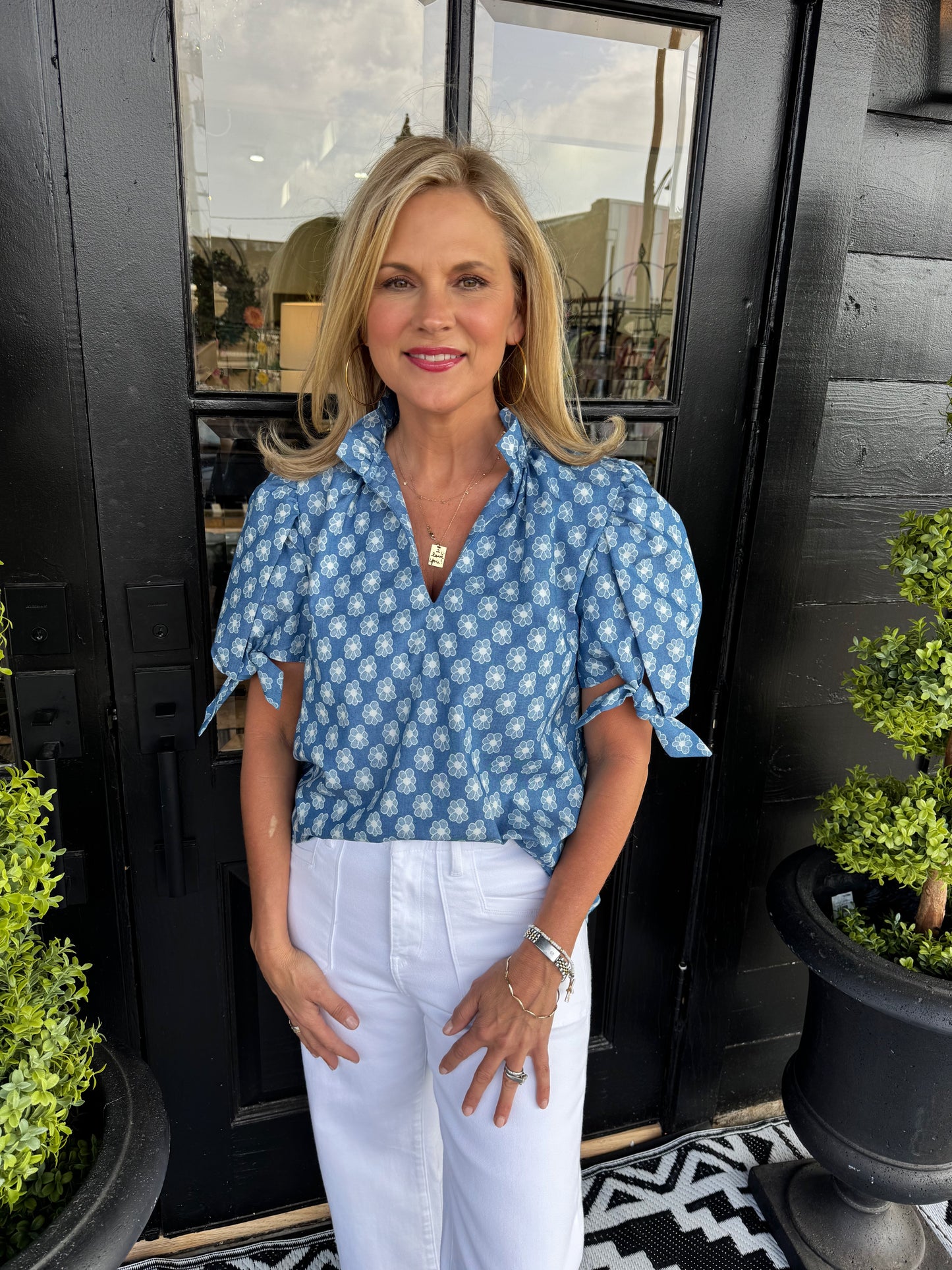 Elevate your wardrobe with the Dorit Top in Dark Blue. Its charming blue floral pattern adds a refreshing touch, making it perfect for casual outings or a day at the office. Enjoy a blend of style and comfort that fits seamlessly into your everyday life.