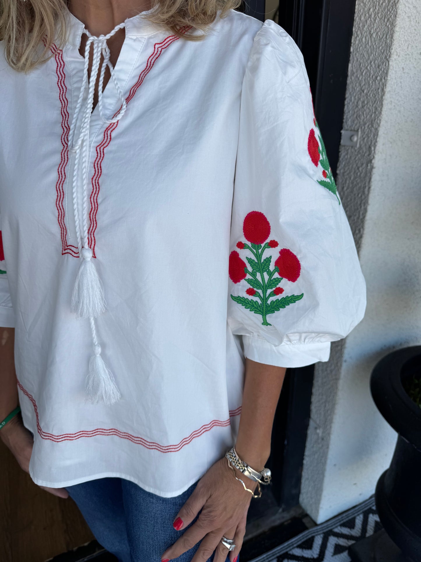 Elevate your wardrobe with the Gabby Top in Off White. Featuring charming embroidered sleeves, this top adds a touch of elegance to your everyday style. Its versatile color makes it easy to pair with your favorite bottoms, ensuring you look effortlessly chic for any occasion.