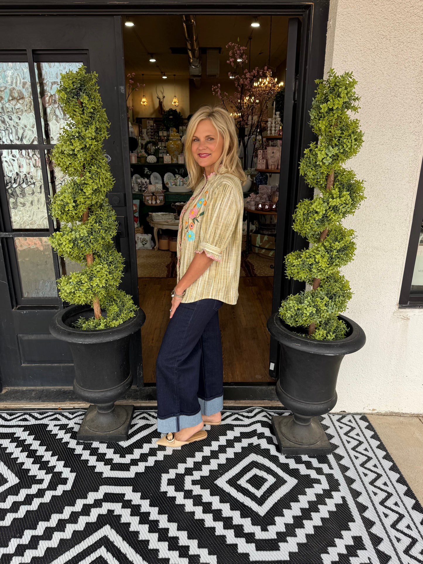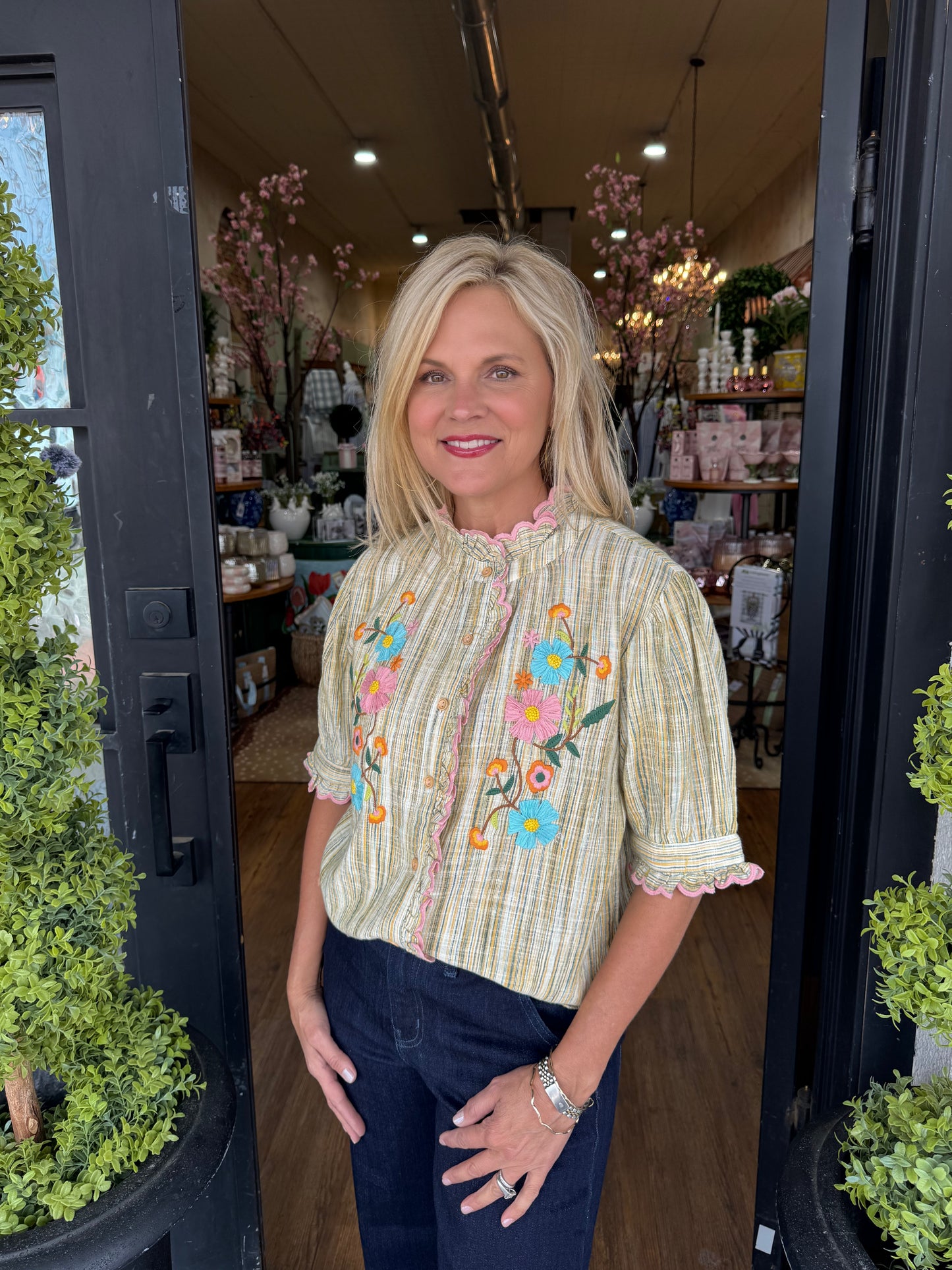 Elevate your wardrobe with this Ivy Jane Ribbon Embroidered Blouse, featuring classic stripes paired with delicate floral detailing. This versatile piece brings effortless style to any occasion!