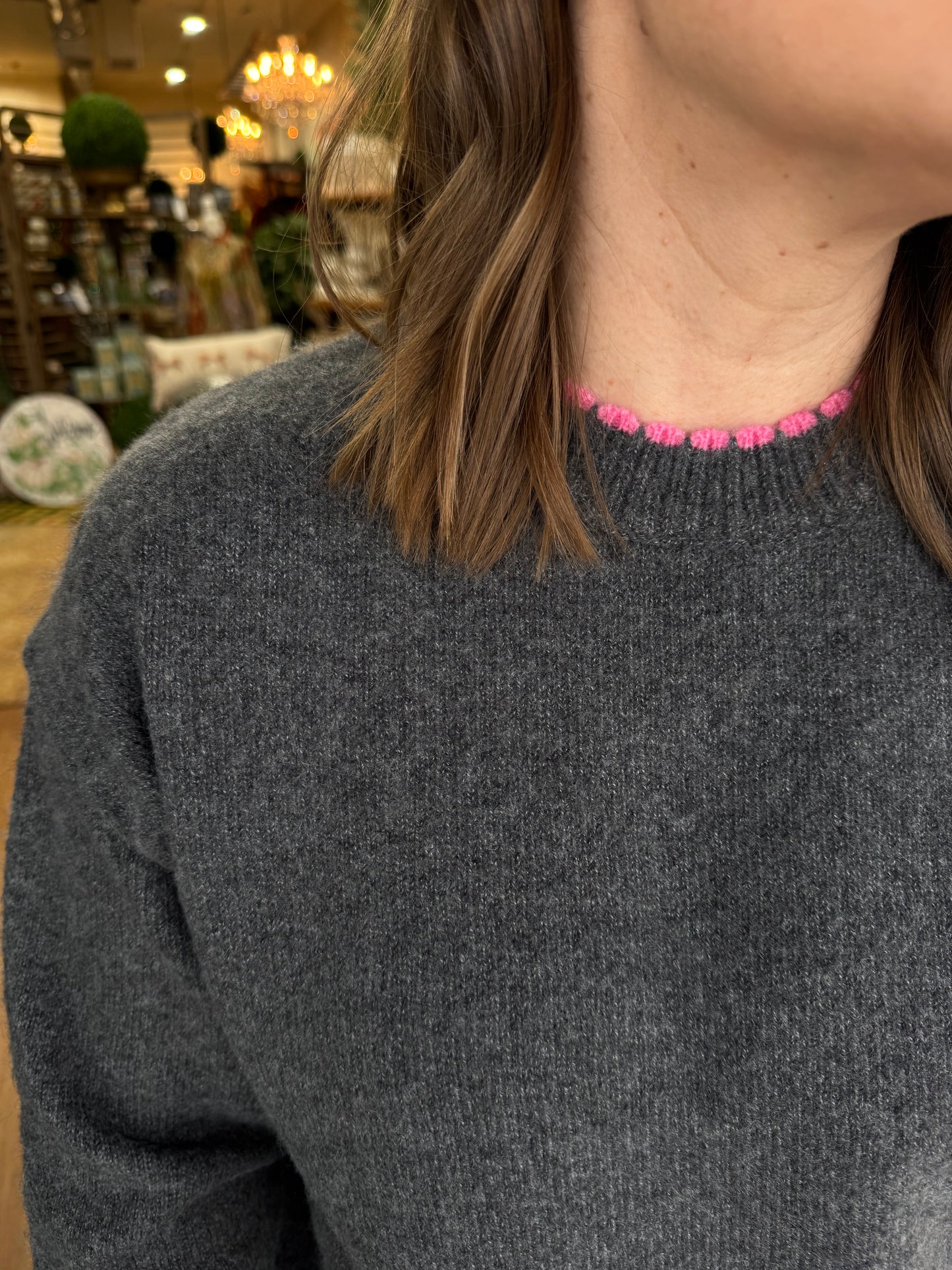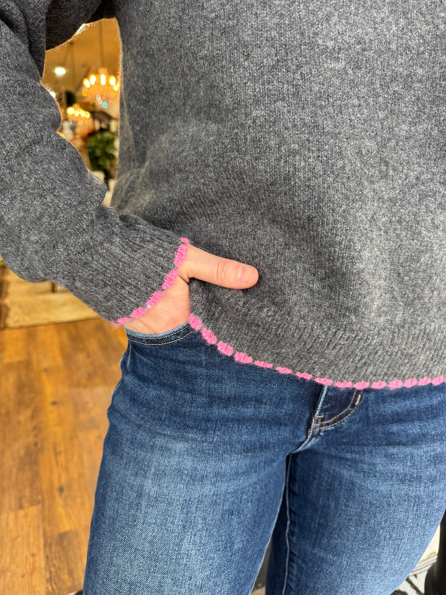 Expertly crafted with a gray knit, the Drew Sweater features delicate pink detailing on the sleeves, adding a touch of feminine flair to your wardrobe. Stay warm and stylish this season with this versatile and chic piece.