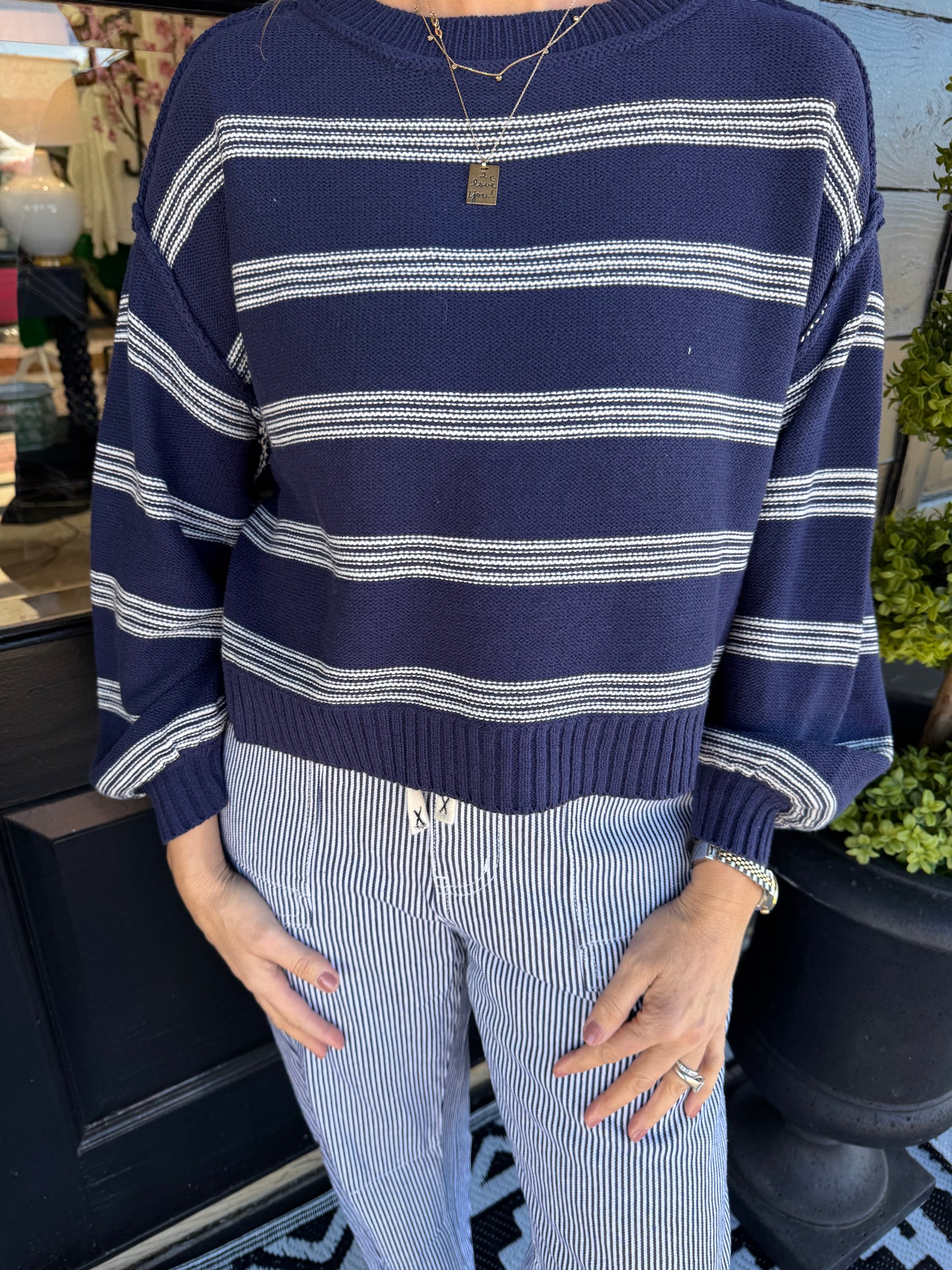 Cozy up in the Etta Sweater, featuring a stylish navy stripe design. This sweater not only looks great but also offers warmth and comfort, making it perfect for casual outings or relaxing at home. It's a versatile addition to your wardrobe that you'll reach for time and again.