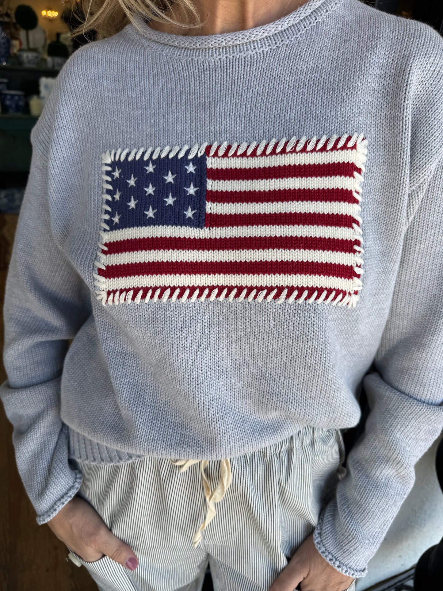 Wrap yourself in patriotic style with the Martha Sweater in classic grey. This cozy knit features a charming American flag design that adds a spirited touch to your everyday wardrobe. Perfect for showing your pride while staying comfortable and chic, whether you're heading out for a casual day or gathering with friends. A versatile piece that celebrates your love for the red, white, and blue in the most fashionable way.