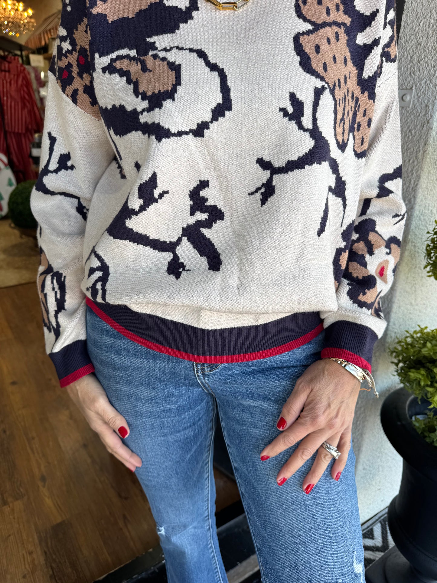 Introducing the Brynlee Sweater in Oatmeal, with navy and red accents. Made from soft, high-quality materials, this sweater offers a comfortable fit while adding a pop of color to your wardrobe. Perfect for layering or wearing on its own, the Brynlee Sweater is a versatile and stylish choice.