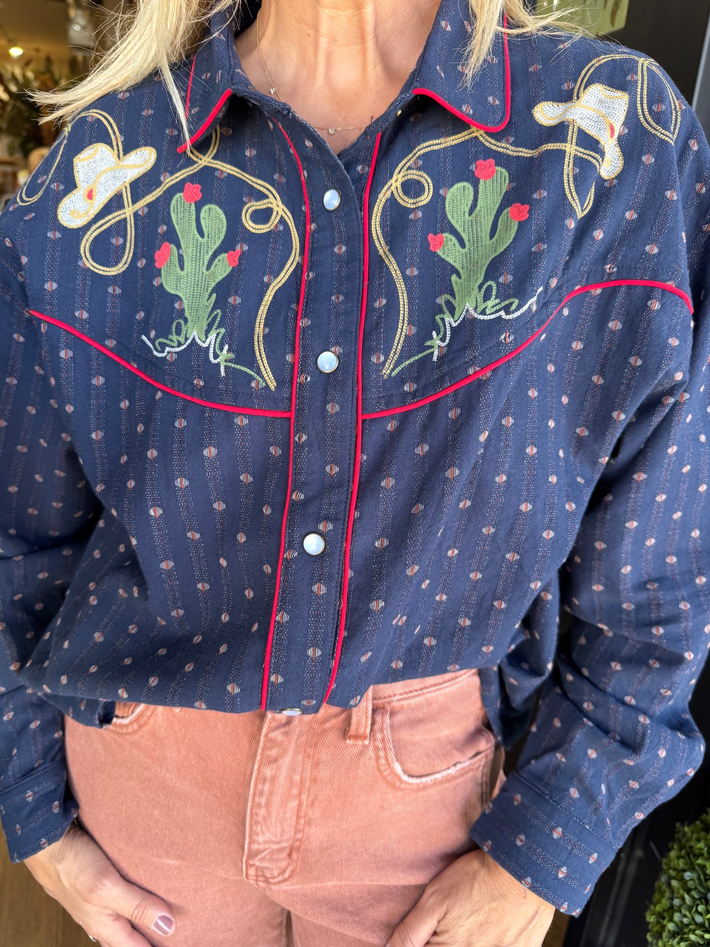 Upgrade your wardrobe with our Charley Top - Western Navy. This classic Western top is perfect for any occasion, adding a touch of sophistication and style to your outfit. Made with high-quality materials and expert craftsmanship, this top offers both comfort and durability. Elevate your fashion game with the Charley Top.