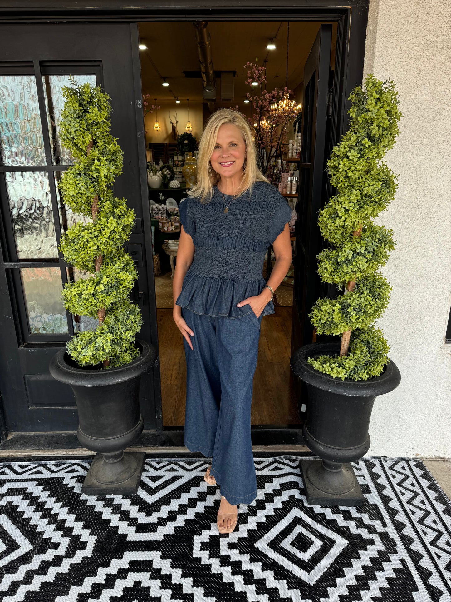 The Elizabeth Set in Indigo features a coordinated two-piece design with a stretchy fabric top that moves with you. The soft, flexible material provides all-day comfort and a flattering fit, while the matching bottom completes an effortless, put-together look. Perfect for layering or wearing as a complete set.