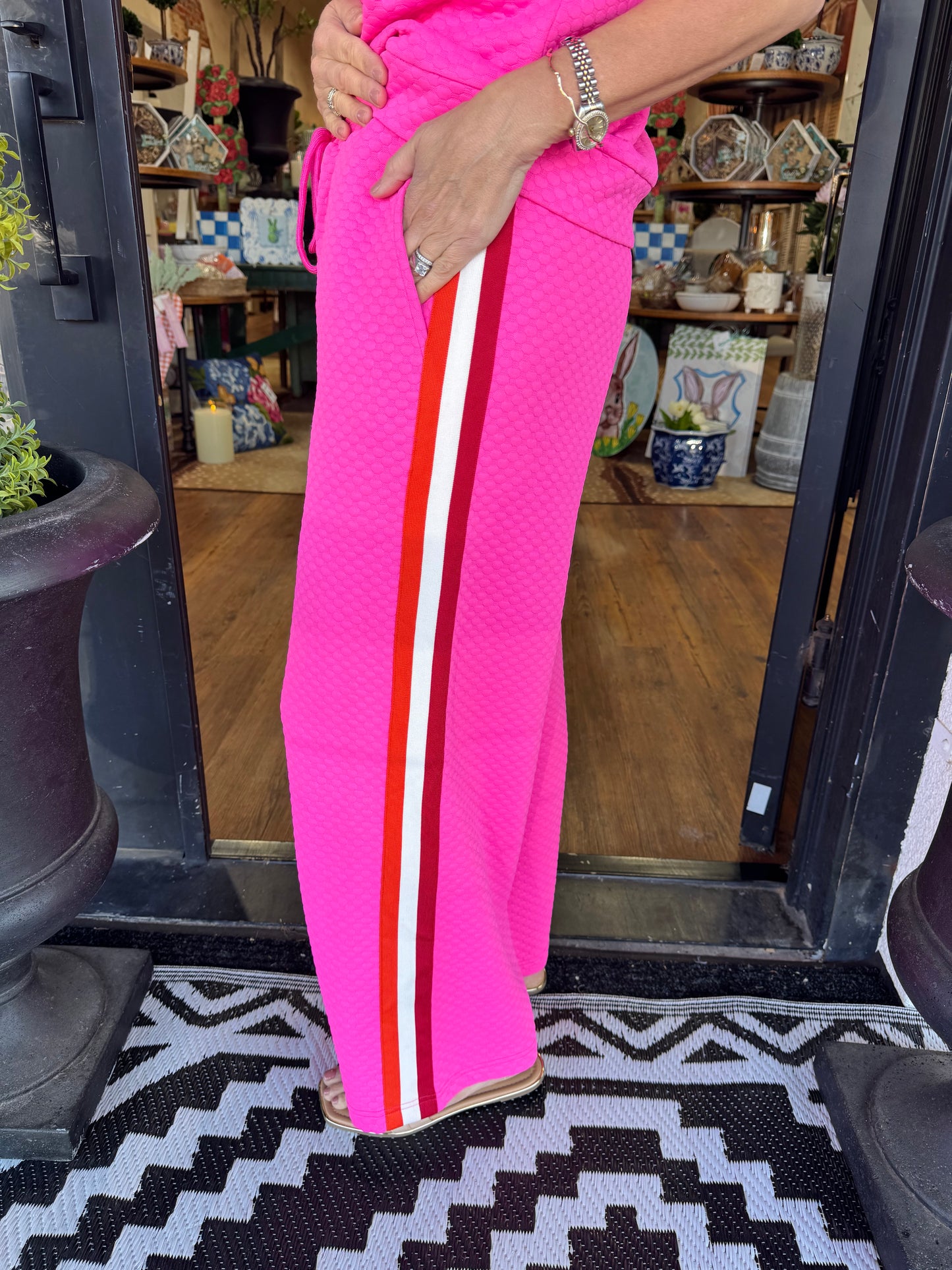 The Joyce Set in Hot Pink is a versatile two-piece outfit designed for comfort and style. Its fabric composition ensures breathability and ease of movement, making it suitable for various activities. This set provides a chic yet laid-back option for both casual wear and relaxed outings.
