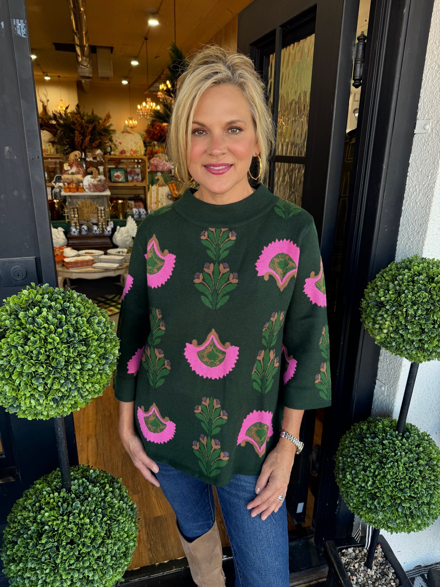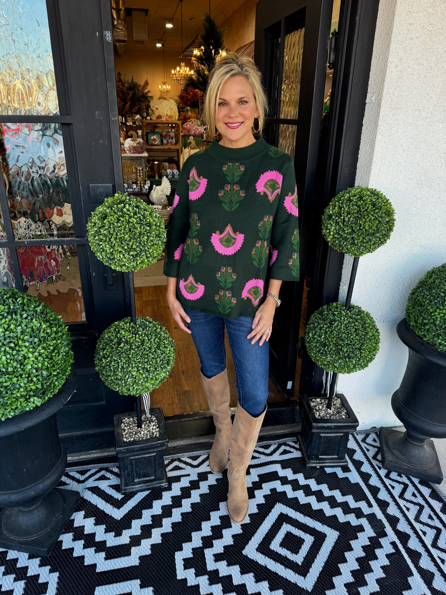 Introducing the Landry Top in Hunter Green. This stylish top features a beautiful floral sweater design that adds a touch of elegance to your wardrobe. Crafted with high-quality materials, it offers both comfort and style for any occasion. Elevate your look with the Landry Top – Hunter Green.