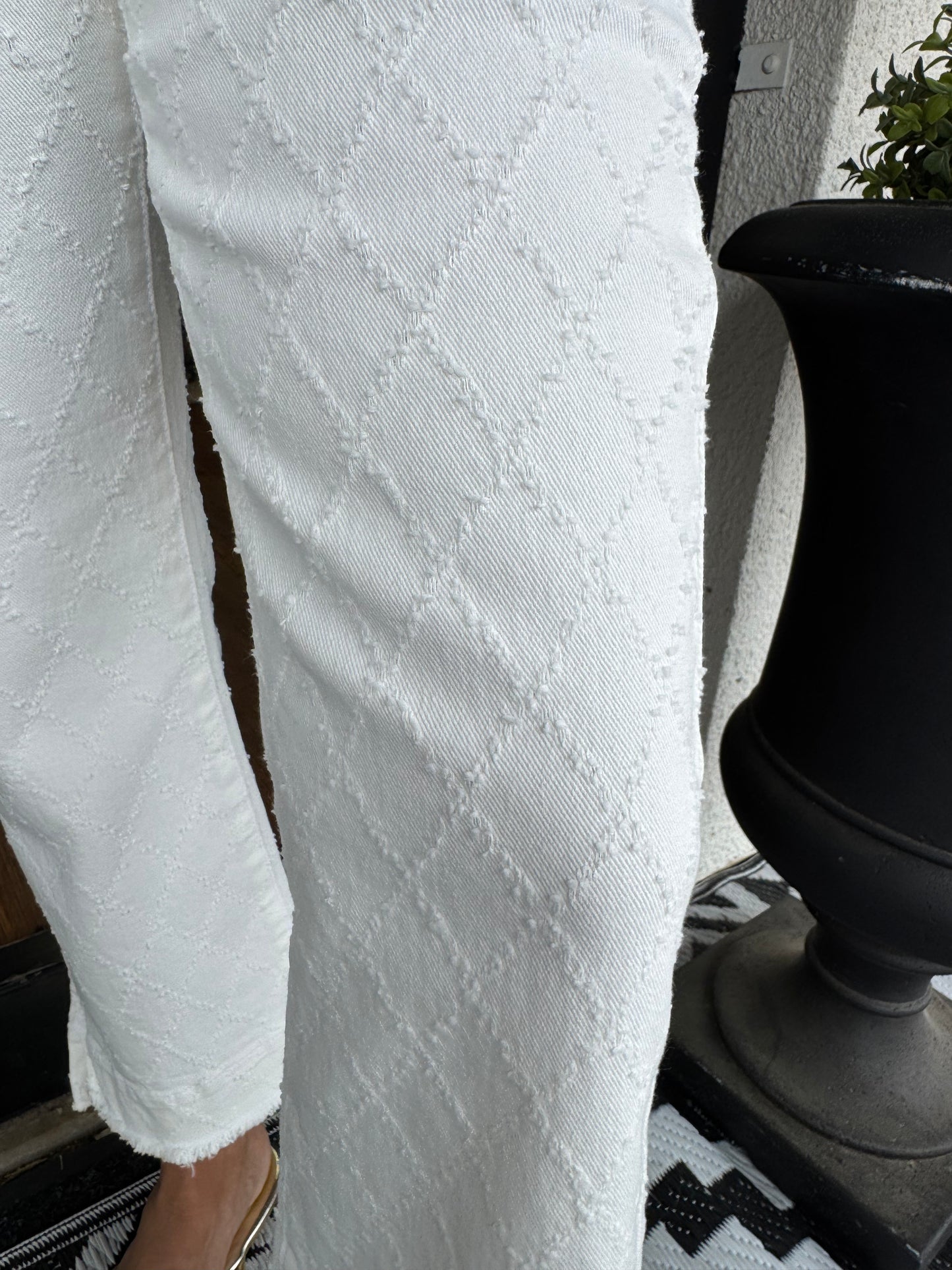 Liverpool Hannah Crop Flare in crisp white with an elegant pattern throughout. This flattering crop flare silhouette features a delicate all-over design that adds subtle sophistication to your everyday wardrobe!