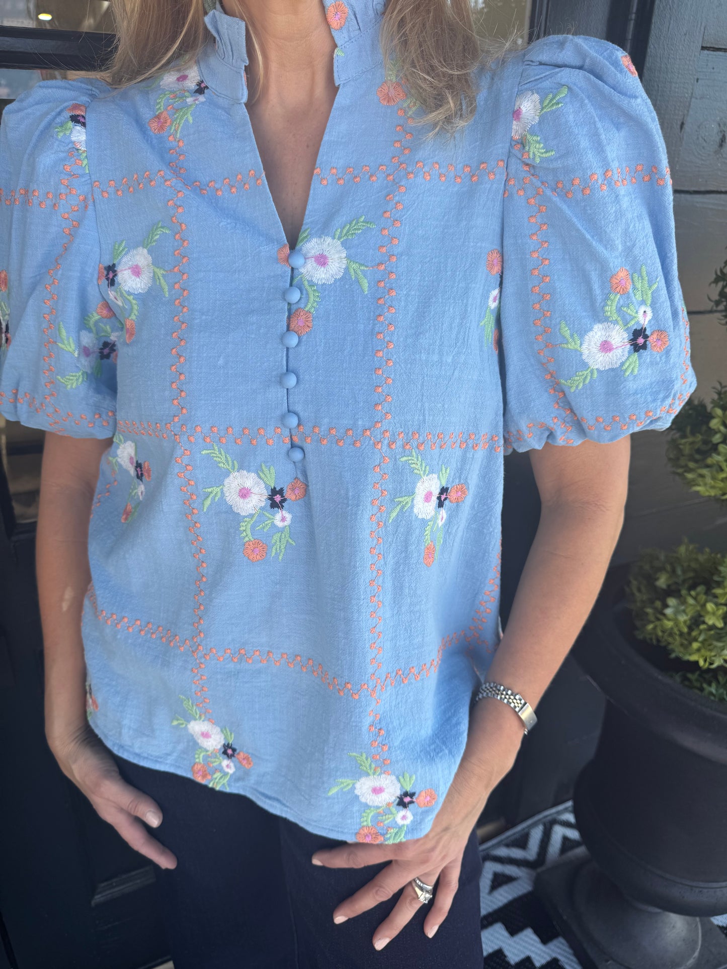 Elevate your wardrobe with the Perry Top in Chambray. Its soft blue fabric adorned with charming floral patterns adds a refreshing touch to your outfit. Perfect for casual outings or layering, this top combines comfort and style effortlessly, making it a versatile choice for any occasion.
